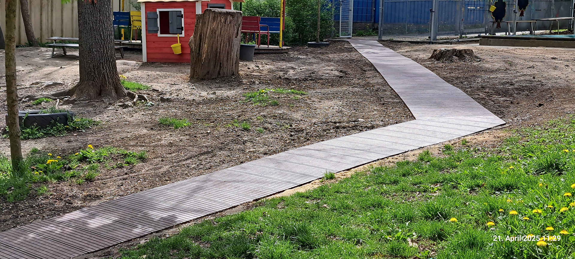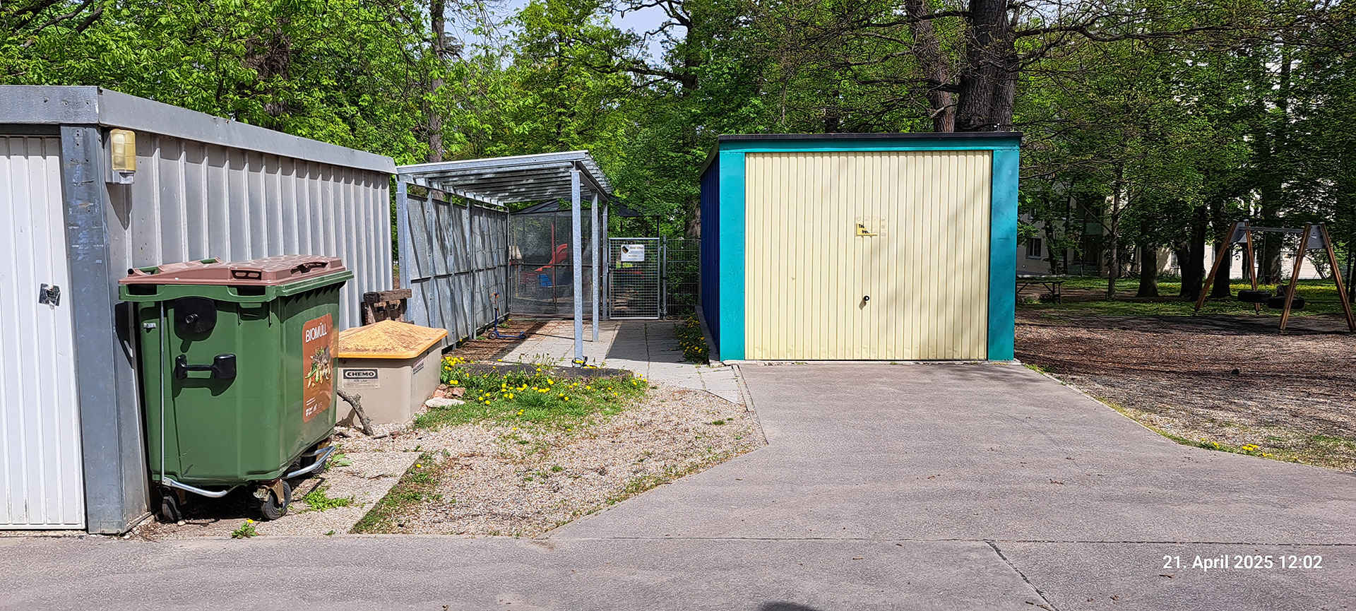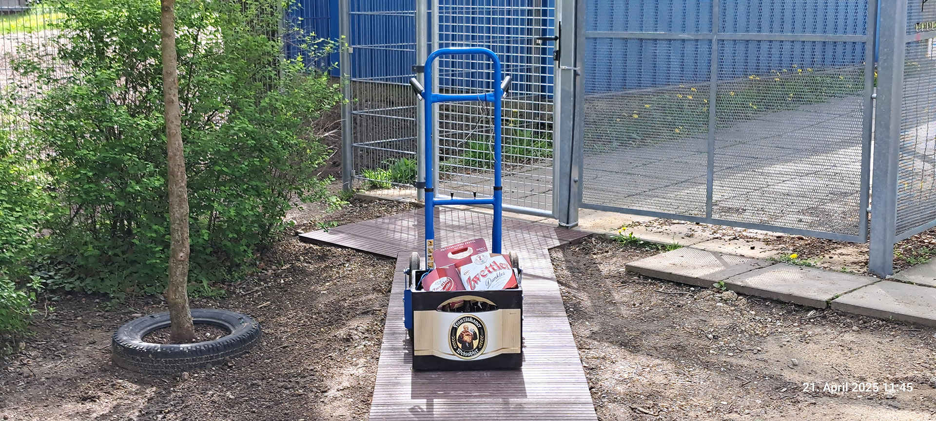 Am Tag vor dem Ableben unseres Papstes Franziskus wurde der neue Budenzugang komplett fertiggestellt und, welche Ironie des Lebens, die erste Bierkiste - ein Franziskaner Weißbier - konnte ohne die sonst übliche Anstrengung statt über Böschungen oder viele Stufen ganz gemütlich bis zum Budeneingang gerollt werden. Damit ist der erste Teil unseres behindertengerechten Budenzugangs Fakt und erlebt seine "Premiere" für Bundesbrüder und Gäste anlässlich der Waldmeisterkneipe am 26. April 2025. Das Zugangstor wurde mit unserer GRAL-Sperranalage ausgestattet und kann von jedem Bundesbruder mit passendem Schlüssel geöffnet werden. Die Öffnungsrichtung ist, von der Straße kommend, nach Rechts innen (einwärts) wie am folgenden Bild zu sehen ist. Daher wurde der Weg hinter dem Tor in Form eines kleinen Podestes gestaltet.